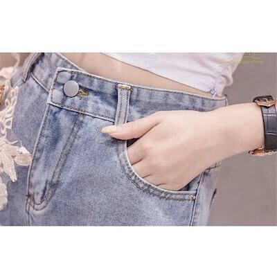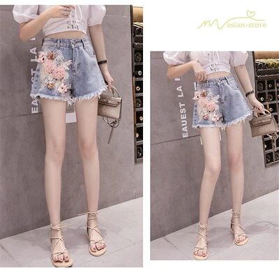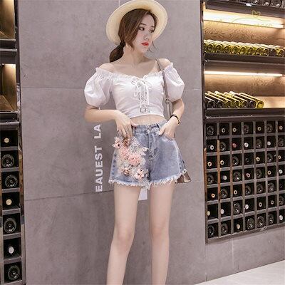 韓国デニムパンツ ダメージ加工 ショーパン ホットパンツ ジーンズ 刺繍 立体花柄 ブルー花柄 個性