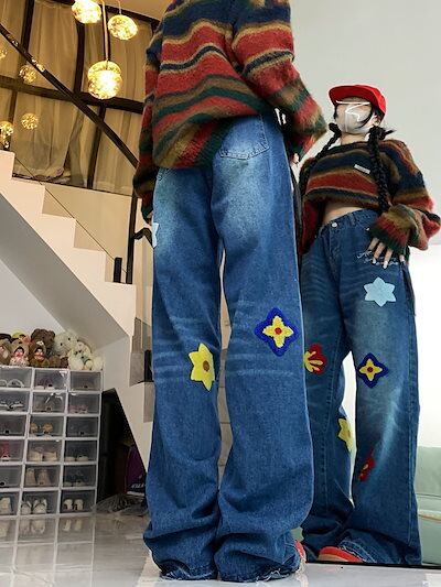 アメリカンレトロレター花びら刺繍ジーンズ女性用ハイウエストスリムストレートワイドレッグフロアモップパンツ