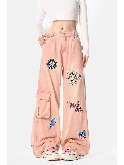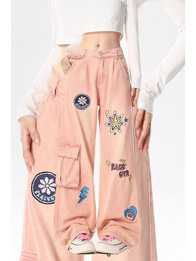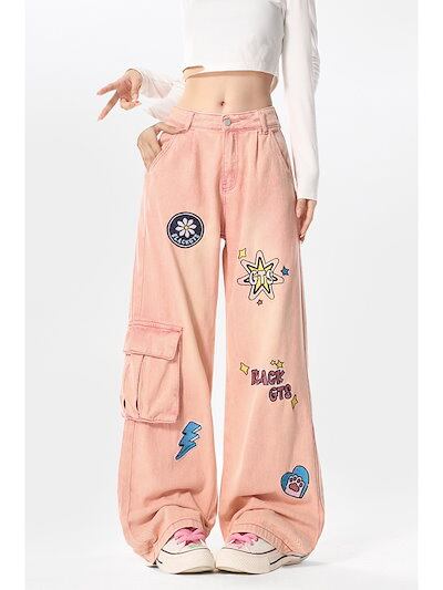 女性用ピンクワークジーンズ刺繍入りルーズストレートワイドレッグロングパンツ