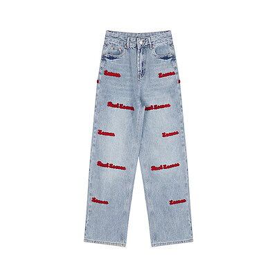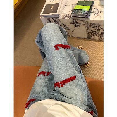 大きいサイズアメリカンレトロハイウエスト刺繍ジーンズ女性春秋ゆったり細ストレートワイドパンツ