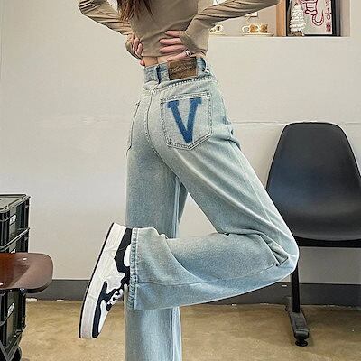 新作ストレートデニムパンツワイドパンツゆったりジーンズ後ろポケットV型刺繍インパクトカラー