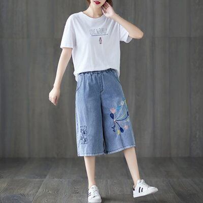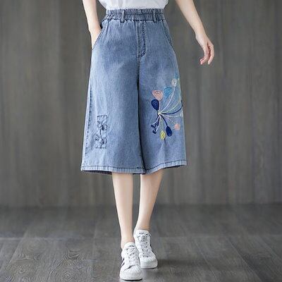七分丈デニムパンツワイドシルエットデニムパンツデニムクロップドパンツ七分丈パンツワイドパンツガウチョパンツ七分丈刺繍花柄ウエストゴム薄春夏ゆったり可愛い