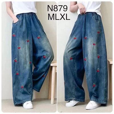 ウエスト875ゴム全体に桜刺繍ソフトドレープ純綿薄手ジーンズ万能ストレートパンツ女性用