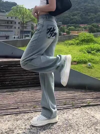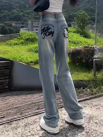 ジーンズ レディースKt猫刺繍ジーンズ女性用夏ハイウエストストレートパンツルーズワイドレッグフロアモップパンツ