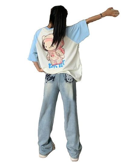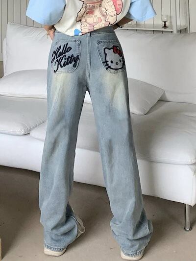 ジーンズ レディースKtキャットパンツ刺繍ポケット付きゆったりスリムベルベットストレートワイドレッグジーンズ