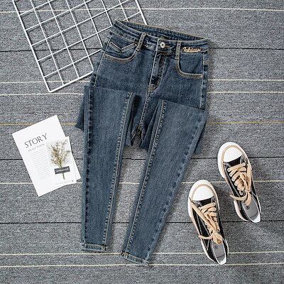 脚長効果!スキニーデニムパンツブルーグレージーンズクロップドパンツ春秋新作刺繍ハイウエストスリムパンツレディース 韓国ファッション
