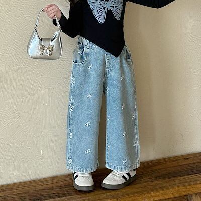 2024秋の新作ガールズ刺繍リボンジーンズ韓国風子供用ロングパンツベビーカジュアルワイドレッグパンツ
