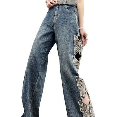 【三日出荷】2024春夏刺繍広脚ジーンズ夏の新型女性レトロなファッション高腰破穴個性カジュアルジーンズ