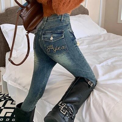 ジーンズ スキニーパンツ デニムパンツ ストレッチ gパン ハイウエスト 刺繍 着痩せ ボトムス レディース 春 夏 秋 カジュアル ファッション