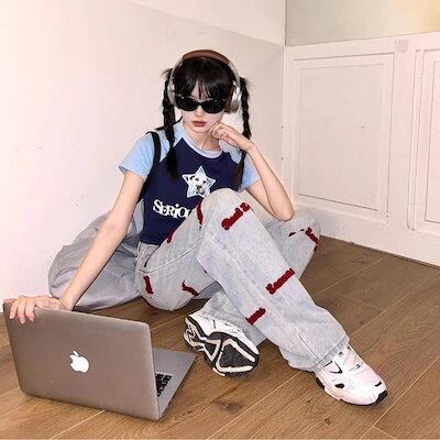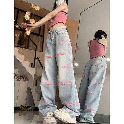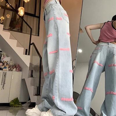 英字デニムパンツ 刺繍 デザインデニム ロゴ ジーンズ ジーパン ルーズ パンツ ボトム ハイウエスト トレンド 定番 カジュアル 韓国ファッション
