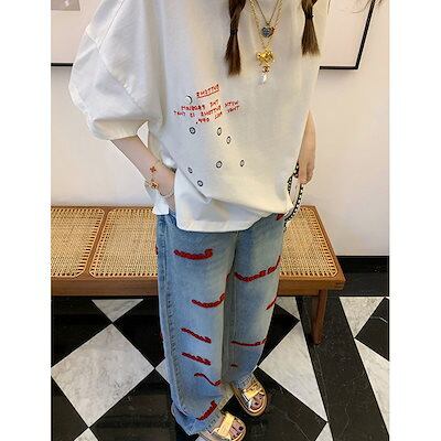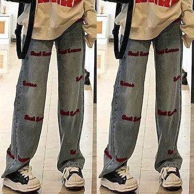 大きいサイズアメリカンレトロハイウエスト刺繍ジーンズ女性春秋ゆったり細ストレートワイドパンツ