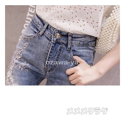 パンツデニムフレアパンツ刺繍大きいサイズレディースハイウエストポケット付き美脚裾フリンジ着痩せロングパンツデニムパンツ不規則きれいめ