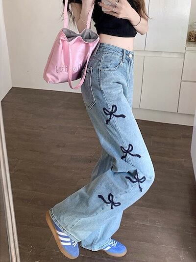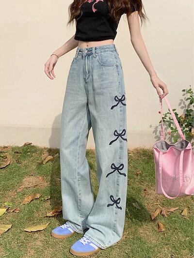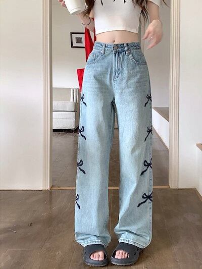 パンツ レディース サイドリボンデニムパンツ サイドリボン刺繍 ハイウエスト ワイドレッグパンツ フロアレングスパンツ 大人可愛い ママコーデ 韓国 オルチャン 人気 トレンド 新作 20代 30代