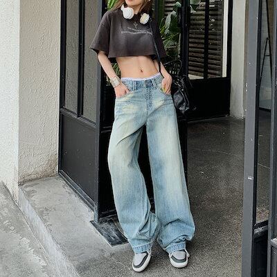 2024春夏アメリカンレトロウォッシュドルーズストレートジーンズレディース刺繍ドレープワイドレッグパンツ