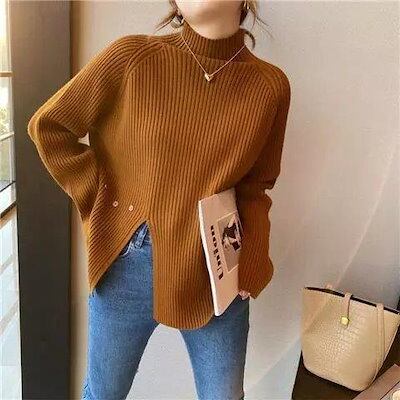 秋冬新作 韓国ファッション 無地 ニット スリット 3カラー セーター ハイネック 厚手 リブニット トップス ニット レディース ニット カシミヤタッチ 福袋