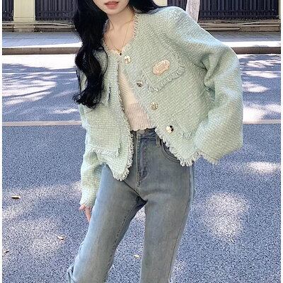韓国版デザイン感小衆毛縁フリンジグリーンコート女性初秋の新感覚小香風ゆったりショート丈トップス