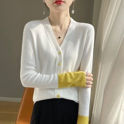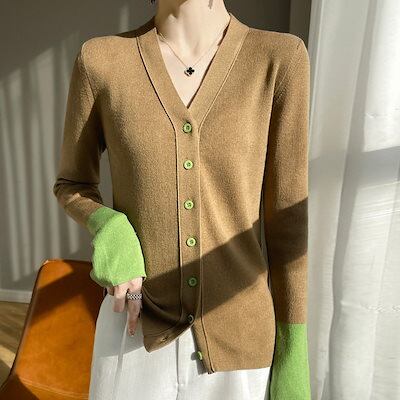 【Qoo10最安値挑戦!!!】 秋の新作フレアスリーブパッチワークカラー 長袖 Vネックカーディガン レディース 快適 アウター通勤