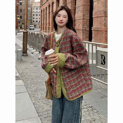 2024年秋冬物ファッション 冬アウター ジャケット韓国 ゆったり グリーンのパッチワークツイード コート レディース 通勤 オシャレ 大人 メイラード