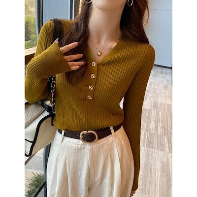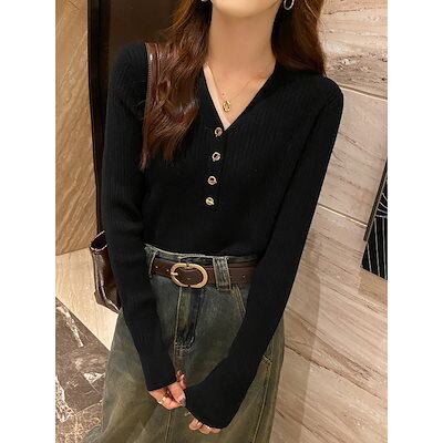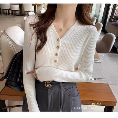 Vネックプルオーバーインナー2024新作秋ファッション 長袖ニット セータートップス