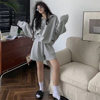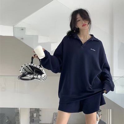 【3日以内出荷】涼しく楽ちんセットアップ 刺繍ポロネックパーカー2024年カジュアルスポーツショーツセット レディース 韓国ファッション