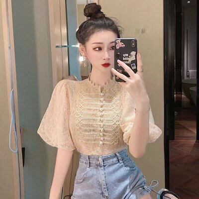 【3日以内出荷】今っぽシアーシャツ気品泡スリーブ半袖レーストップス 2024年夏新作デザイン感 数釘ビーズシフォンシャツ 春先取りブラウス