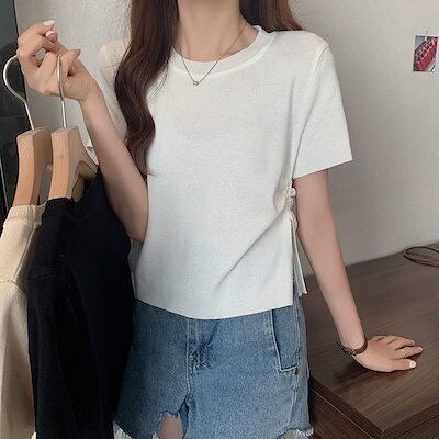 Tシャツ イレギュラーベルト半袖2024新型サマースリムショート丈トップス レディース 韓国ファッション