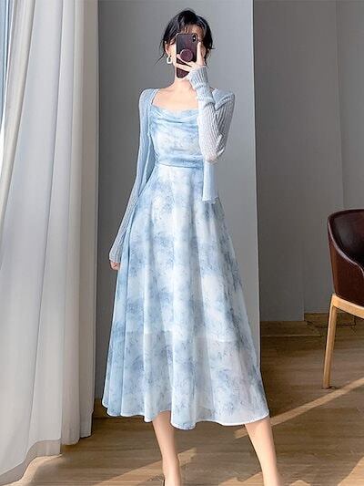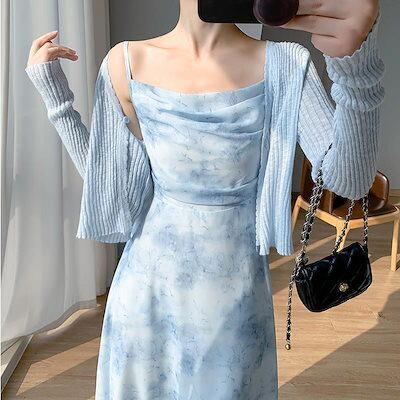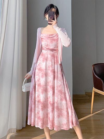 ワンピース 2024夏新作キャミソールワンピースフレンチシフォン花柄ロングスカートカーディガン2点セットドレス レディース