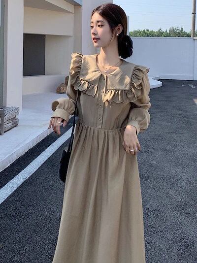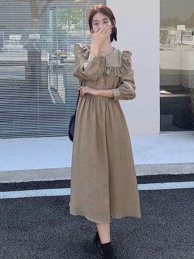 ワンピース ドレス 森ワンピース春と秋の優しいハイウエスト気質スレンダー長袖木耳元ドール開襟ロングスカート レディース