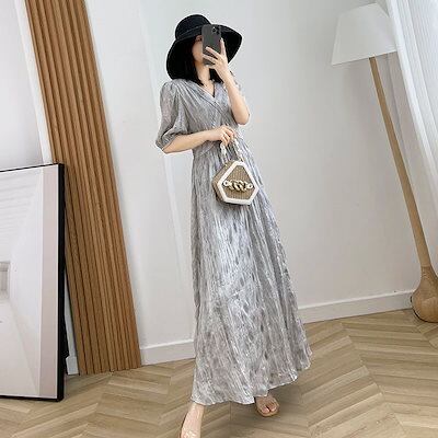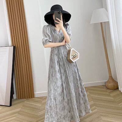 ワンピース 肌理感グレーワンピース 2024夏の新作気品フレンチレトロロングスカート ドレス レディース