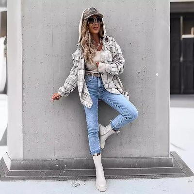 アウター ヨーロッパとアメリカ 婦人服 秋冬新作 フード付き ルーズ チェック柄 ボタン シャツ ジャケット?韓国