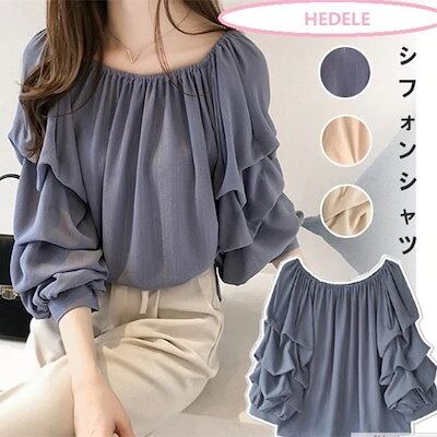 ブラウス シャツ レディース クルーネックトップス韓版 ボートネック ゆったりシフォン デザイン感 長袖サテンシャツブラウス シャツ レディース