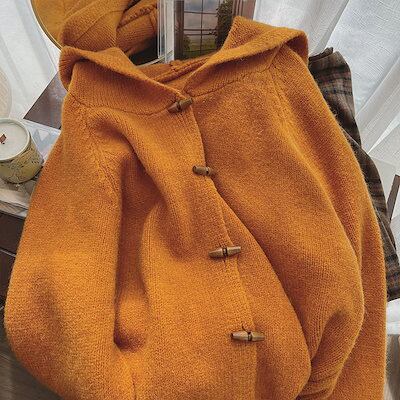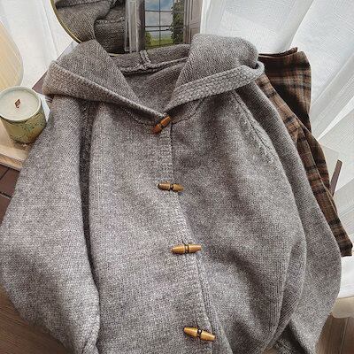 【 3日出荷 】カーディガン 2024 秋新韓国 ニットカーディガン 百掛け 牛角ボタン連帽ニットカーディガン レディースファッション