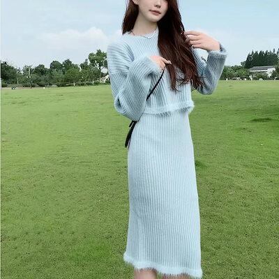 秋冬韓国ファッション 秋冬セーターセット厚手保温アップセーターカーディガンスカート気質スカート冬ウォームツイストニット