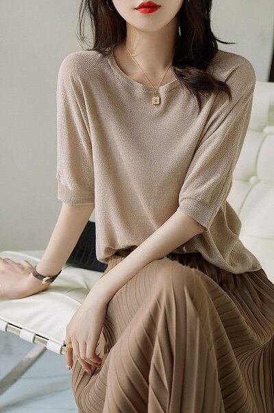 2024 春夏新作 アイスシルク ニット tシャツ 薄手 ゆったり Vネック 半袖ブラウス トップス レディース 20代 オシャレブラウス 半袖 ブラウス 大人 通勤 シャツ 白シャツ ロンt Tシ