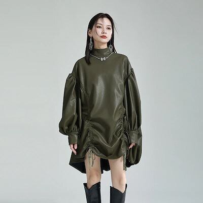 秋冬 新作 おしゃれ 気質 ワンピース 立ち襟 ランタン袖 長袖 ワンピース PU 不?? ワンピース