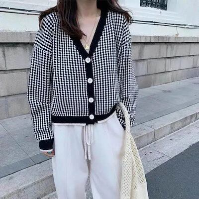 ジャケット 秋 韓国 ニット カーディガン セーター チェック コントラストカラー Vネック ゆったり トップス 百掛け カジュアル韓国ファッション