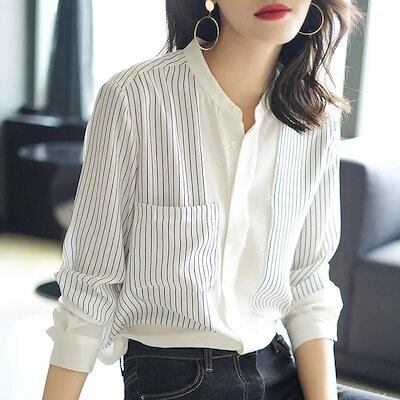 【3日間発送】 2024 新作 秋 シャツ OL ブラウス 秋 ルーズシフォンシャツ 女性 ストライプ Vネック長袖
