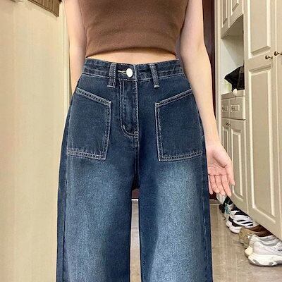 2024 初秋 デニムパンツ ブルーとグレーのアメリカンワイドレッグジーンズ 女性用大ポケットストレートハイウエスト小梨型体型ドラッグパンツ 韓国ファッション