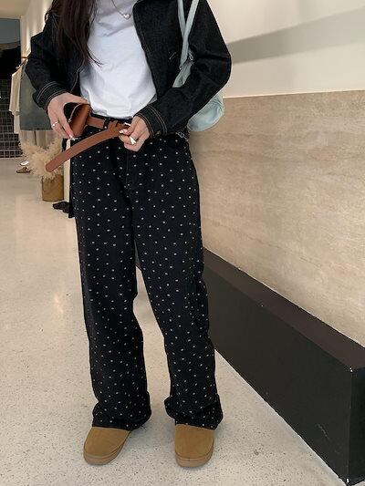 2024 初秋 デニムパンツ パンツ ワイド ストレート 花柄 ハイウエスト 脚長効果 美脚効果 細見え ブラック 黒 甘辛 かわいい おしゃれ カジュアル レディース お出かけ 韓国ファッション