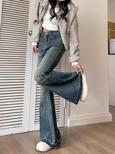 2024 初秋 デニムパンツ パンツ デニム ジーンズ スキニー ワイドレッグ ハイウエスト 脚長効果 美脚効果 細見え 水色 ライトブルー グレー カジュアル レディース お出 韓国ファッション