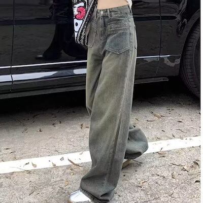 2024 初秋 デニムパンツ レトロジーンズ女性新作ハイウエスト薄型デザインワイドパンツストレートドラッグズボン潮 韓国ファッション