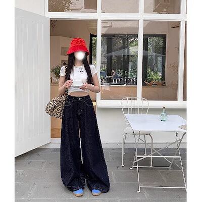 2024 初秋 デニムパンツ パンツ ロング丈 デニム ジーンズ ワイド ストレート ハイウエスト 美脚効果 脚長効果 細見え レトロ インディゴブルー レディース かわいい お 韓国ファッション