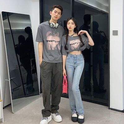 カップル ペアルック tシャツ ゆったり グレー 夏服 カップル 半袖 トップス カップルお揃い tシャツ ins風 韓国風 男女兼用 ゆったり 夫婦お揃い ペアルック tシャツ 可愛い おしゃれ 記