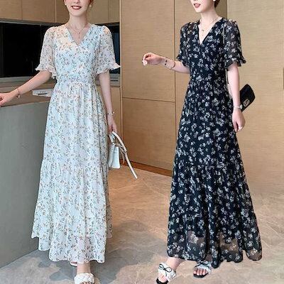 レディース シフォン ワンピース リゾート ロングワンピース きれいめ 上品 春 夏 秋 マキシワンピース マキシワンピ リゾートワンピース サマードレス 30代 40代 50代 大きいサイズ 黒/白
