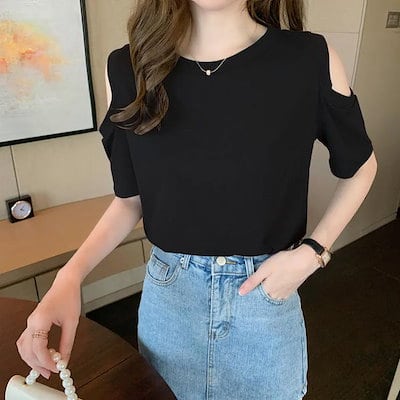半袖 グレー カットソー Tシャツ レディース 肌見せ 半袖Tシャツ 無地 オフショル 肩出し 肩あき 送料無料 クルーネック 夏 トップス ゆったり ビッグTシャツ ブラック ホワイト オフショルダ