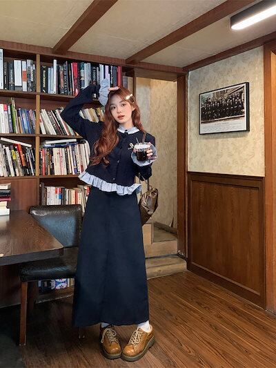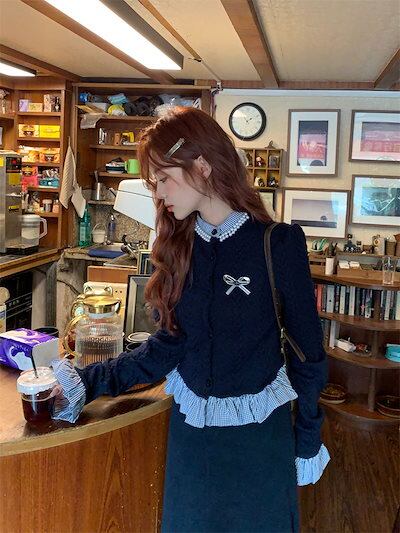 セットアップ カレッジスタイルフェイクツーピース蝶結び長袖セーターレディース秋ルーズショートニットトップス