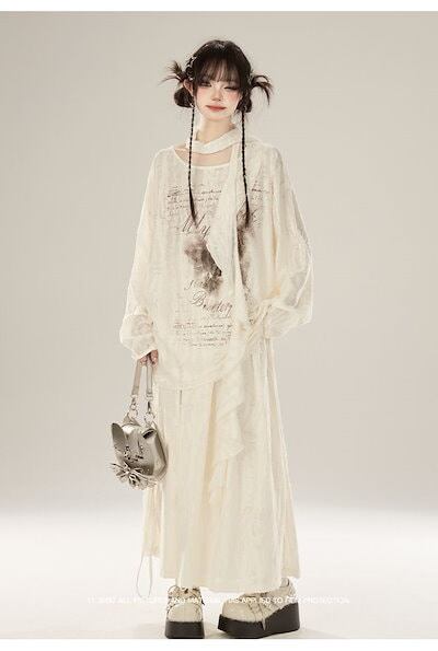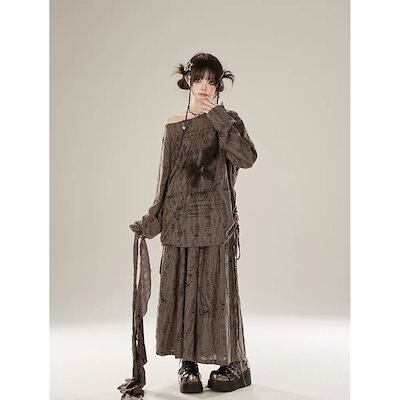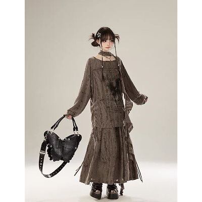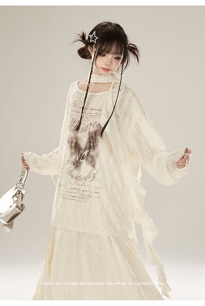 セットアップ 2024新作蝶プリントカジュアルルーズ穴開き長袖Tシャツ+半そでスカート2点セット