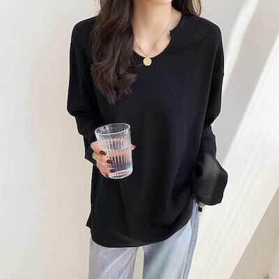 ロンT 秋の新しいカジュアルワッフルルーズ長袖Tシャツ女性の無地薄いセクショントップス