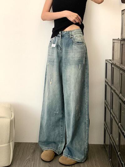 デニムパンツ ワイドレッグジーンズレディース破れたデザインセンス緩いドレープストレートジーンズパンツ