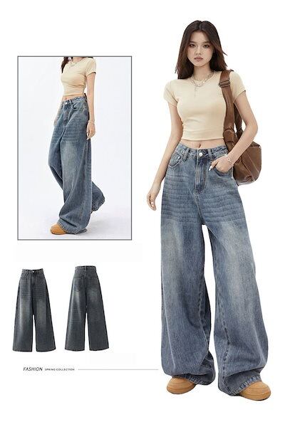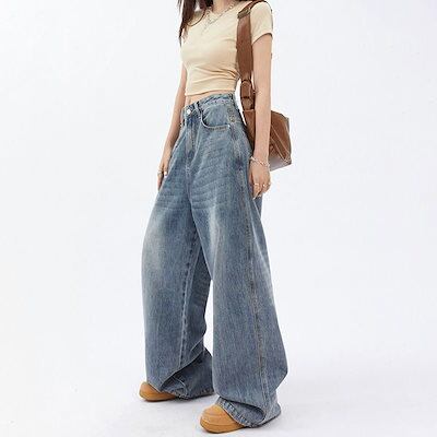 デニムパンツ レトロルーズワイドレッグジーンズレディースニューハイウエストドレープストレートジーンズパンツ